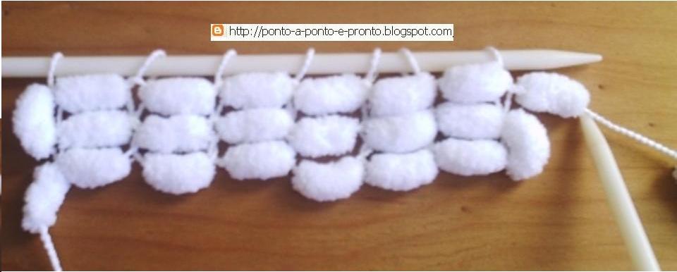 Pra esse espaço de fio eu colocaria 2 pontos entre os pompons, usando uma agulha 3,5mm pra tecer.