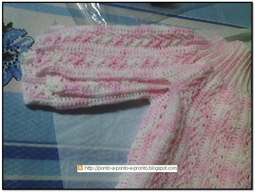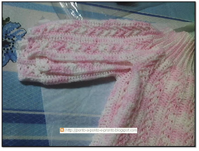 Para o punho não ficar muito justo, fiz diferente da receita. Quando estava trabalhando os "vezinhos" do ponto fantasia, fazia ponto fantasia até o final da manga; qdo estava nas carr. de p.a normais, finalizava com 8 p.b (pegando só no fio de trás do ponto anterior).